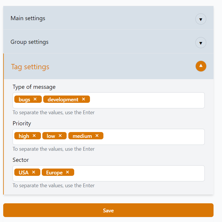 При создании тэгов в каждом разделе: Надо написать текст и нажать «Enter» после каждого тэга.